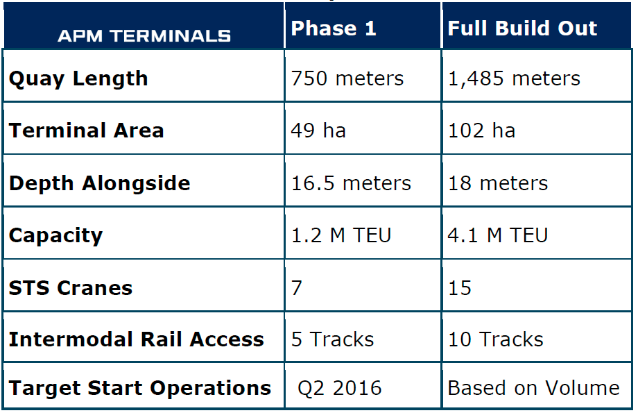 Phase I of the $900 million semi-automated deep-water terminal at Mexico’s second-busiest container port to open soon with 750 meters of quay and 1.2 million TEU annual throughput capacity.