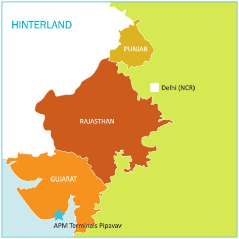 Just beyond APM Terminals Pipavav's immediate hinterland are the northwest markets of Rajasthan, Delhi/NCR and Punjab. Together, these areas generate approximately 60% of India's cargo. Cargo-intensive markets in Rajasthan include Jodhpur, Bhilwara, Udaipur, Jaipur, Kota and Bhiwadi. In Punjab, Amritsar, Jalandhar, Ludhiana, Mandi Gobindgarh and Chandigarh produce a large volume of cargo.