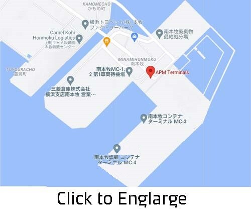 Take Route 16 towards Yokohama, continue straight on at the Honmokumakado intersection, and cross the overpass toward Kamomecho. Cross the "Minamihonmoku Ohashi" that you can see at the end and proceed toward the container terminal on your right side.