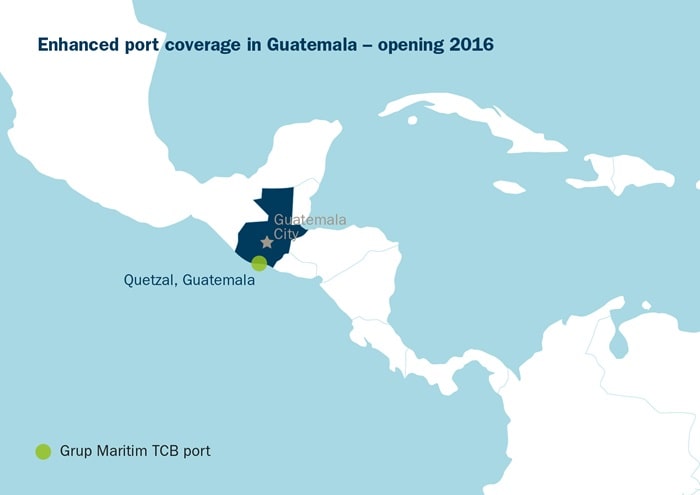 Grup Maritim TCB consists of Spanish container terminal concessions in Barcelona, Valencia and Castellon, on the Mediterranean coast, along with the concessions in Gijon, on the Bay of Biscay, and in the Canary Islands: Santa Cruz on Tenerife and La Palma on Gran Canaria. Outside of Spain, Grup Maritim TCB’s terminal operations include Izmir, Turkey; Yucatan, Mexico; Quetzal, Guatemala (under construction, opening 2016); Buenaventura, Colombia, on the Pacific Coast; and Paranagua, Brazil.